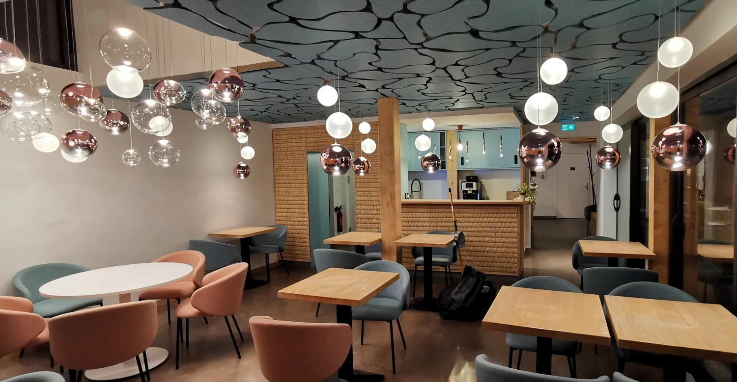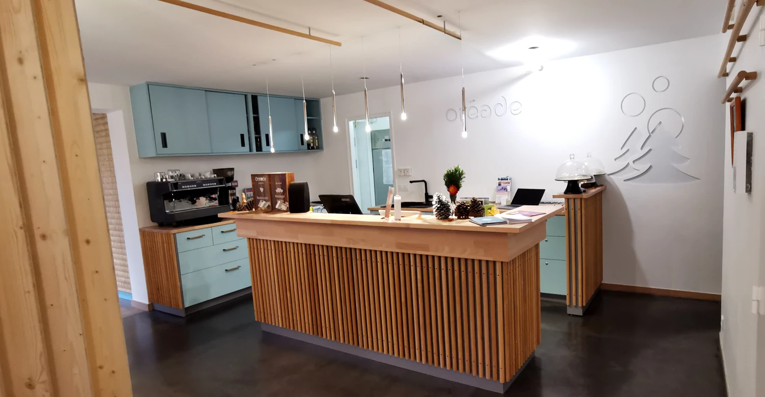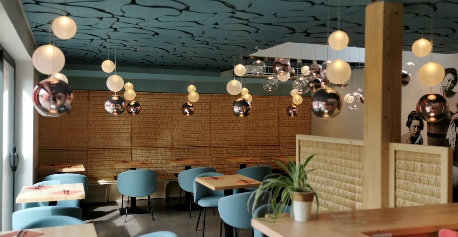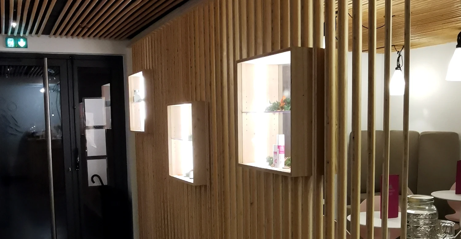 Fabrication et mise en oeuvre de mobilier pour les espaces de restauration et d’accueil, comprenant claustras, habillages muraux et plafond acoustique.